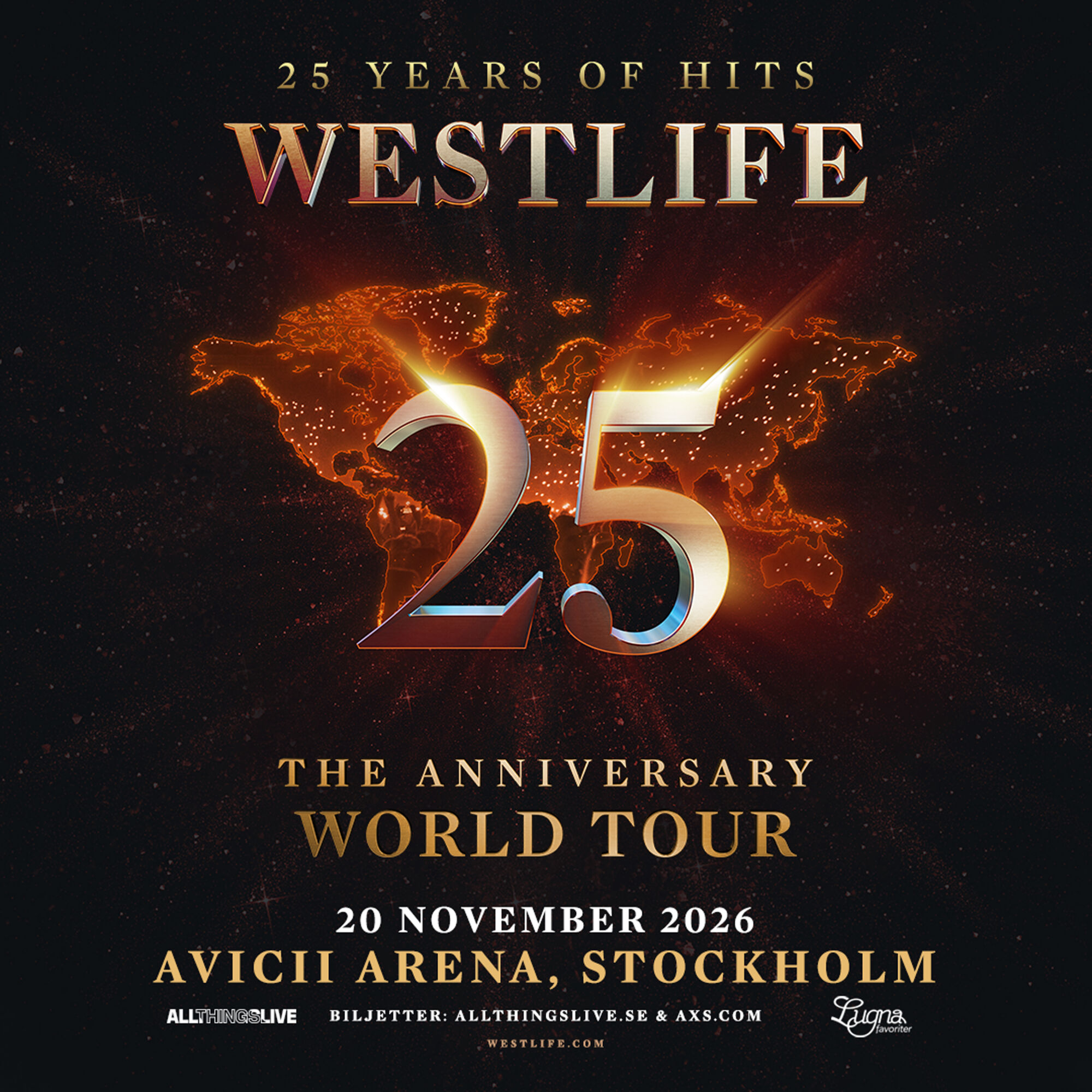 Westlife will once again embark on a world tour, this time during their 25th anniversary! The tour kicks off in September 2026, and offers a euphoric, hit-filled set that spans Westlife's extraordinary 25-year career - from timeless ballads to global chart-topping hits. On November 20, they will land at Avicii Arena in Stockholm for a crackling arena show.